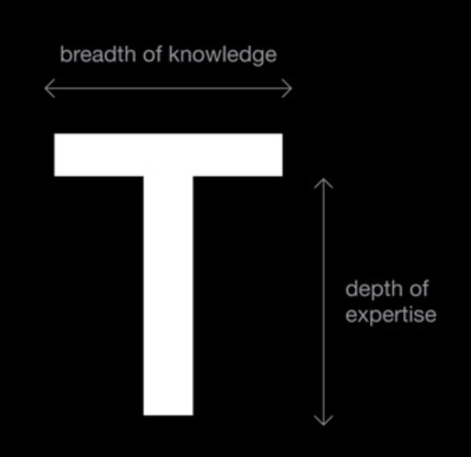 The model of learning and experience isn't just getting surface knowledge about a lot of different areas. That would be completely ineffective. I'm talking about the IBM model of "T" knowledge. This means having both an incredible grasp on several subjects (the horizontal bar) and having deep knowledge in several areas (the vertical bar).